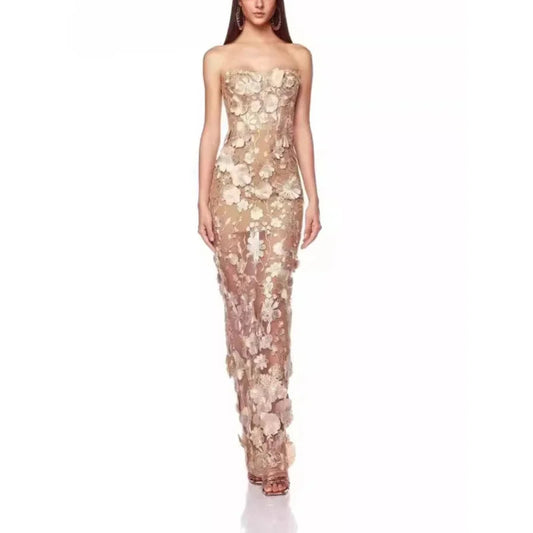 Solid Slimming Temperament Dresses for Women Strapless Sleeveless Patchwork 3D Flowers Elegant Dress Female Style