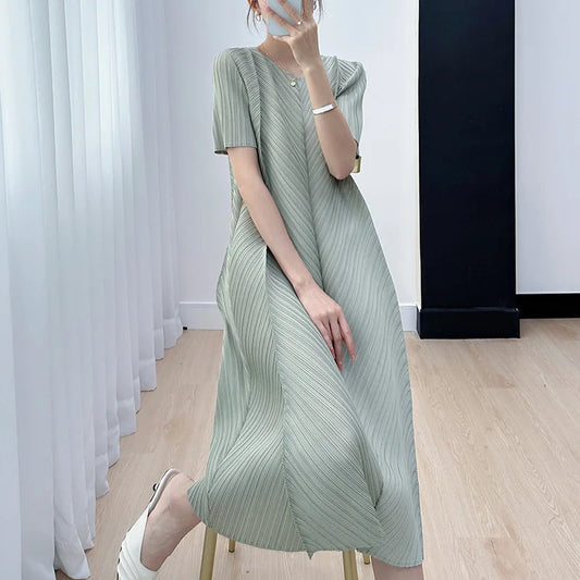 Pleated Dress for Women 2025 Summer New Casual Loose Oblique Pleated Pure Color Minimal Versatile Short Sleeve Dresses