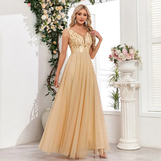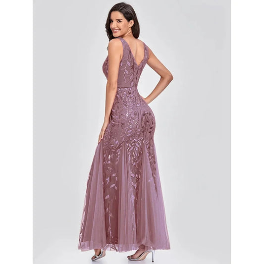 New Women Sleeveless Elegant Evening Dresses V-Neck Sequin Embroidery Flower Long Birthday Party Gown Mermaid Formal Dress