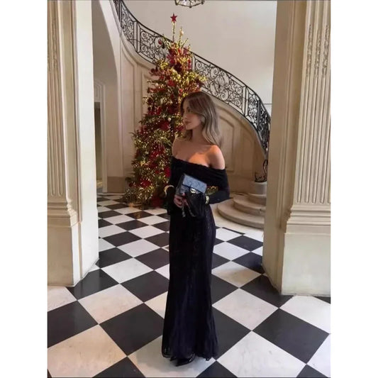 black lace maxi dress Off Shoulder Long Flare Sleeves sexy Evening gown zipper back mermaid gown New high fashion dress women