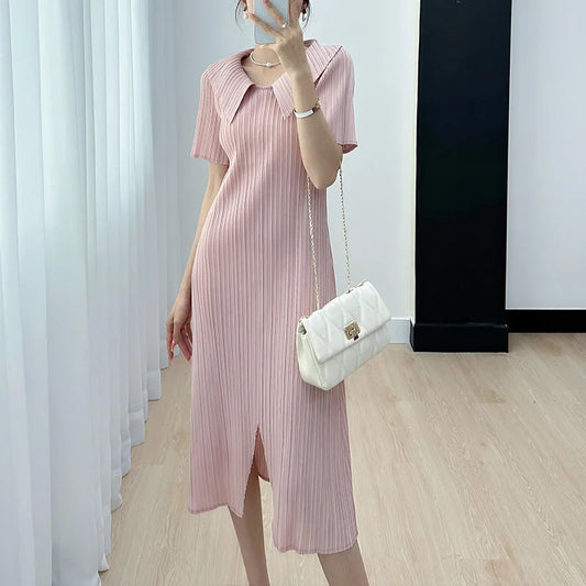 Pleated Dress for Women 2025 Summer New Skirt High-End Temperament Youthful-Looking Niche Lapel Slit Versatile Dresses